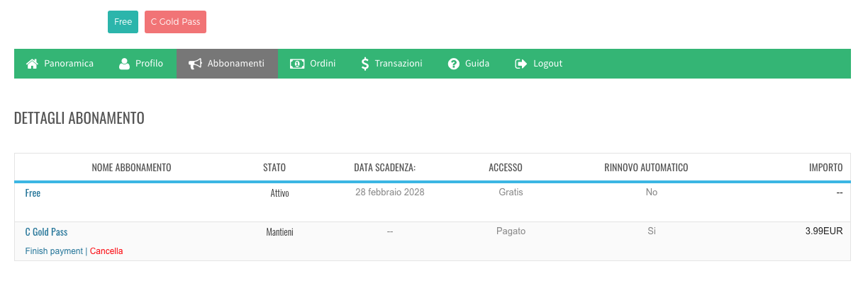 Nel caso in cui tu voglia completare il pagamento in un secondo momento, oppure il tuo browser non ha reindirizzato correttamente a Paypal, devi effettuare il login a Il tuo account, poi cliccare nella voce in basso abbonamenti, e con il mouse andare sul nuovo abbonamento attivato e cliccare su Finish payment (guarda lo screenshot qui sotto).