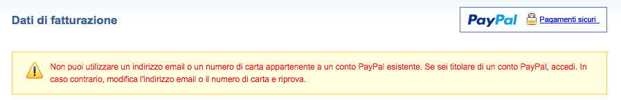 N.B. Se la carta di credito che stai utilizzando o l’email inserita durante il pagamento è già collegata ad un account Paypal, il sistema ti chiederà di effettuare il pagamento inserendo i dati di accesso al tuo conto Paypal dandoti questo errore