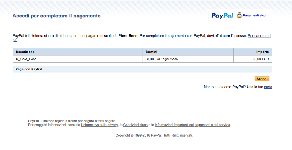 Paypal: Dopo aver cliccato su abbonati verrai reindirizzato a Paypal. Se hai un conto Paypal puoi inserire le tue credenziali di accesso ed effettuare il pagamento utilizzando il tuo conto Paypal.